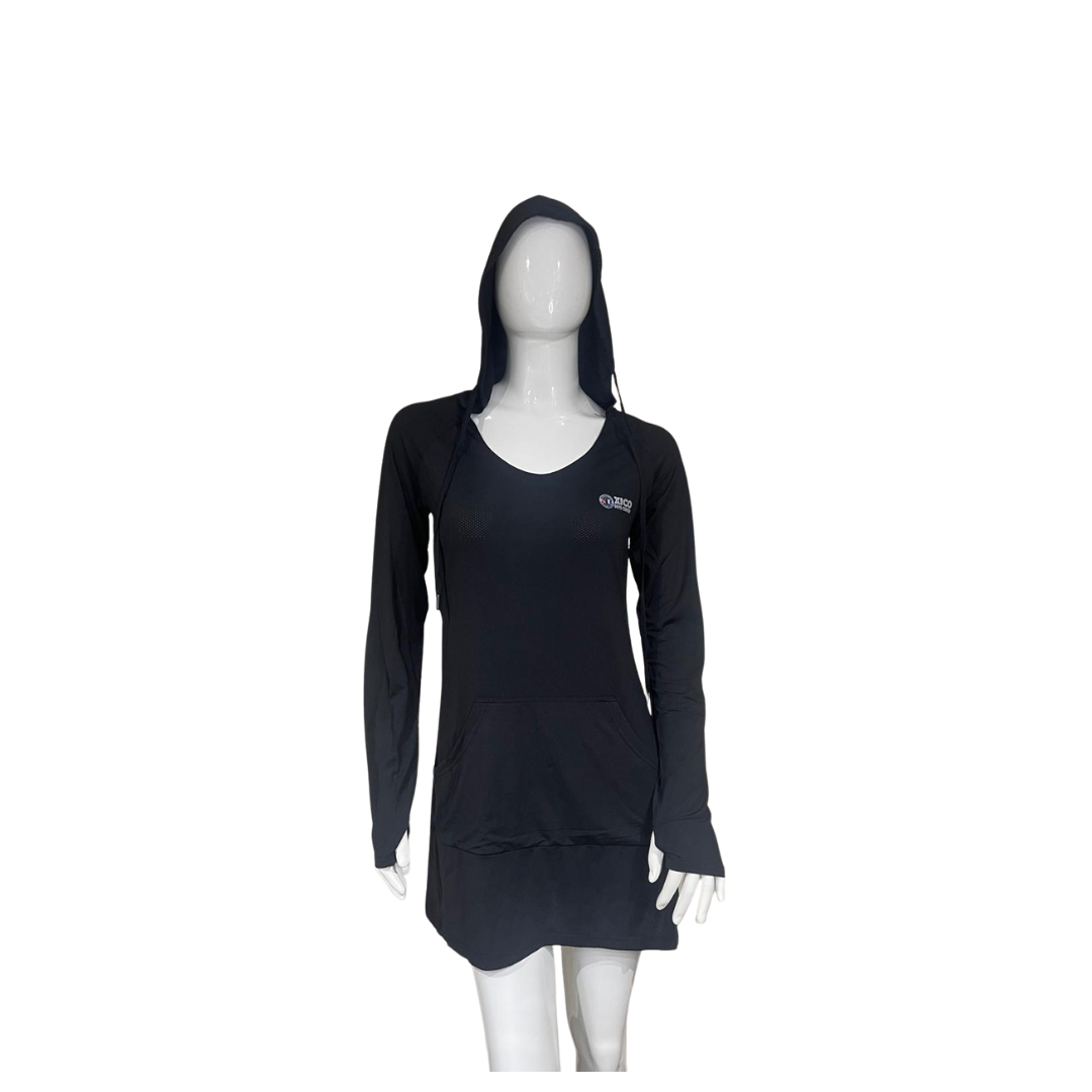 This soft hooded shirt offers SPF 50+ protection, made from a breathable blend of 88% polyester and 12% elastane, proudly made in Mexico. Its long silhouette can be styled as a dress, featuring a kangaroo pocket and thumb hole cuffs for added comfort and functionality. Designed to provide SPF 50+ sun protection for all your sun soaked adventures.